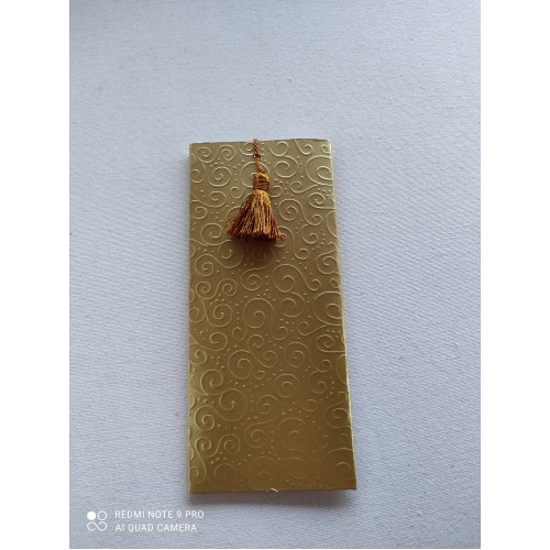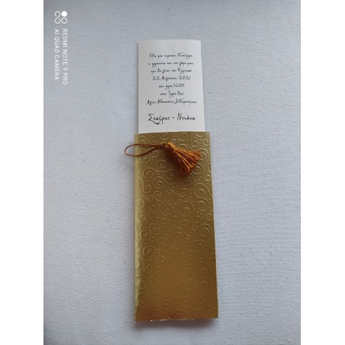 Φάκελος από ανάγλυφο, χρυσό χαρτόνι 22,5cm x 10cmμε κάρτα από χαρτόνι ιριδίζον 19,5cm x 9cm και λεπτομέρεια με χρυσή φούντα. Παράδοση εντός 15 ημερών από την καταβολή του 50% του συνολικού ποσού.