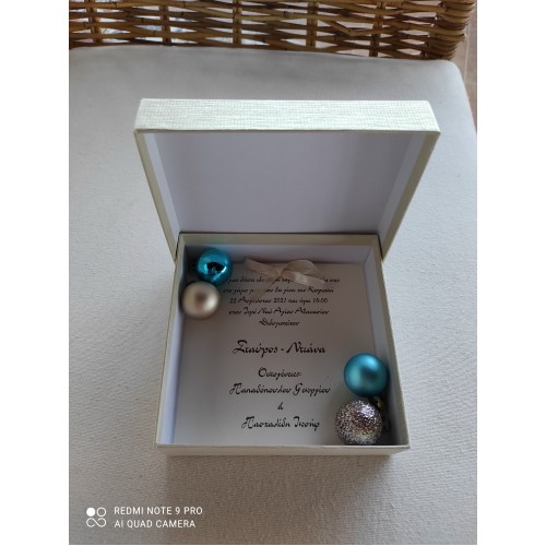 Κουτί με καρτέλα κρεμ "δέρμα" και φιογκάκι ιβουάρ σατέν. Μπορείτε να τοποθετήσετε μέσα στο κουτί την μπομπονιέρα σας ή ότι άλλο επιθυμείτε. Εμείς σας προτείνουμε τις χριστουγεννιάτικες μπαλίτσες. Οι Χριστουγεννιάτικες μπαλίτσες δεν περιλαμβάνονται στην τιμή. Αν το επιθυμείτε συμπληρώστε το στα σχόλια. Παράδοση εντός 15 ημερών από την καταβολή του 50% του συνολικού ποσού.