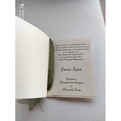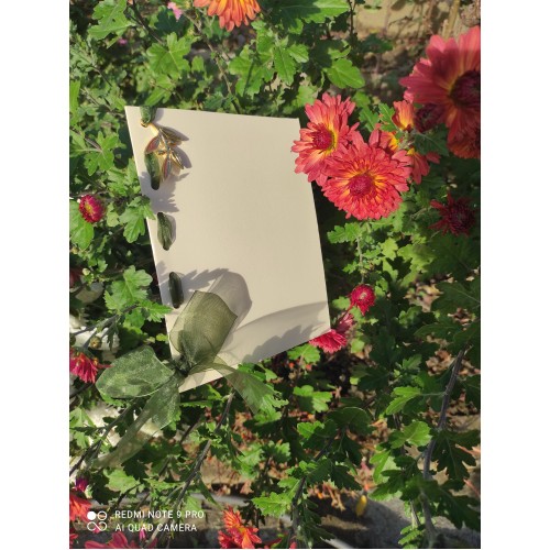 Κάρτα διπλή από ιριδίζον χαρτόνι με κορδέλα οργάντζα λαδί 25mm και χρυσή ελιά. Παράδοση εντός 15 ημερών από την καταβολή του 50% του συνολικού ποσού.