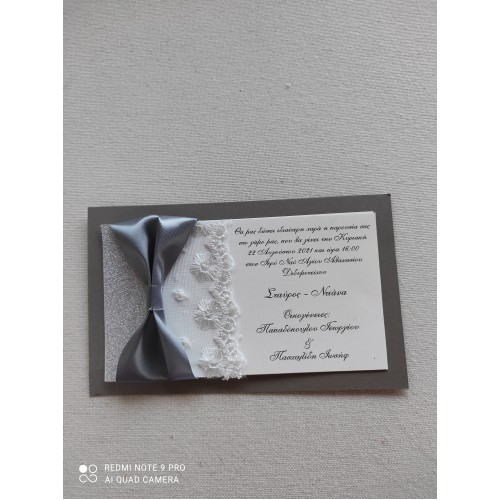 Κάρτα από ασημί περλέ χαρτί, με λεπτομέρεια ασημί glitter, γκρι σατέν κορδέλα 50mm, λευκή δαντέλα και χαρτί βέλβετ λευκό. Παράδοση εντός 15 ημερών από την καταβολή του 50% του συνολικού ποσού.