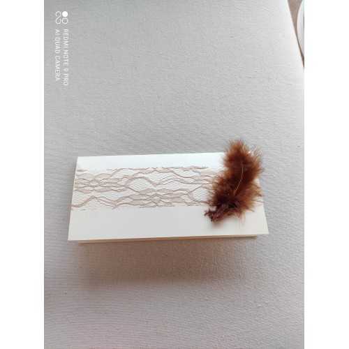 Κάρτα αναδιπλούμενη, ιβουάρ ιριδίζον χαρτόνι, μπεζ κορδέλα δαντέλα 50mm και πούπουλο σε γήινες αποχρώσεις. (Τα πούπουλα στις γήινες αποχρώσεις και στις μπλε αποχρώσεις διαφέρουν μεταξύ τους). Παράδοση εντός 15 ημερών από την καταβολή του 50% του συνολικού ποσού.