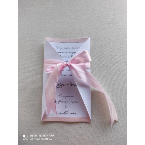 Προσκλητήριο Γάμου χειροποίητο με ρόζ σατέν κορδέλα 25mm